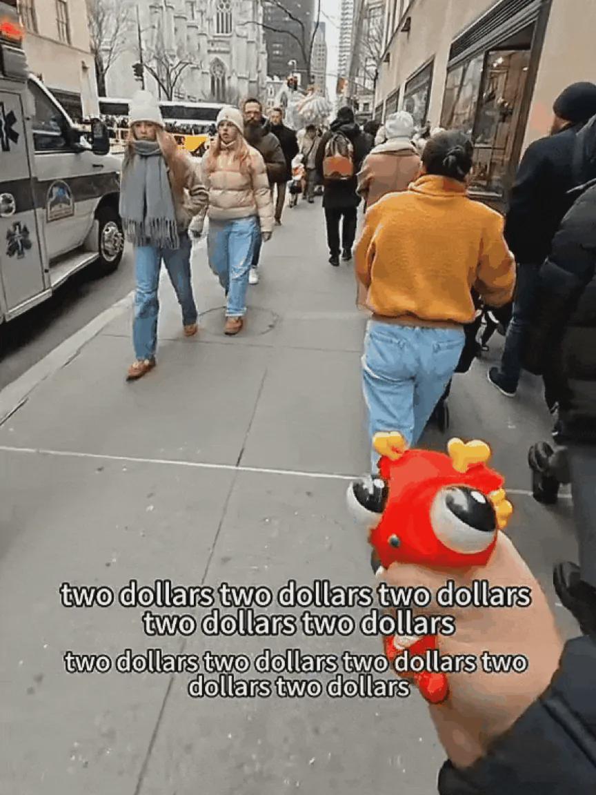 在人来人往的纽约时代广场,这哥们儿跟个NPC一样,逢人就推销手里的捏捏乐,甭管老外问什么,他就准备了两个答案: