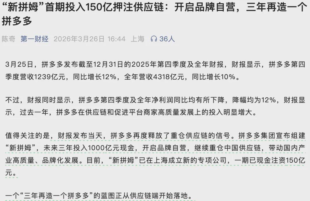 其实说这话的时候,拼多多在上海那边已经落地新公司了,一期直接砸了150亿现金,未来三年打算投1000亿。