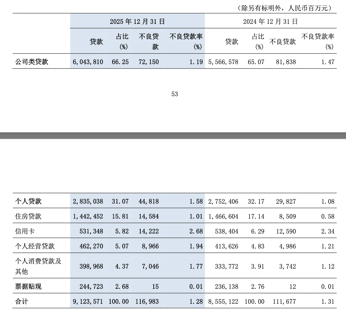 其中,公司类贷款不良率为1.19%,较上年末下降0.28个百分点;个人贷款不良率为1.58%,较上年末上升0.5个百分点。在个人贷款中,住房贷款不良率从0.58%上升至1.01%,信用卡不良率从2.34%上升至2.68%,个人经营贷款不良率从1.21%上升至1.94%;个人消费贷款及其他不良率从1.12%上升至1.77%。