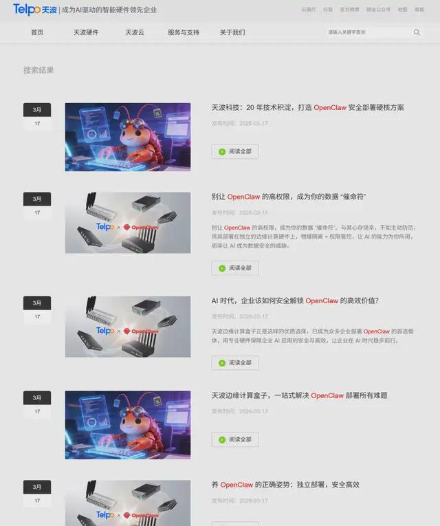 从2026年3月中旬开始,随着“养龙虾”热的不断升温,天波科技官方网站就开始连续发布多篇有关OpenClaw硬件部署内容的文章,如《养“龙虾”选对载体才不踩坑,边缘计算盒子成OpenClaw最优解》、《养龙虾=企业提效?OpenClaw六大办公场景+边缘盒子安全部署攻略》、《一文读懂!OpenClaw部署在边缘计算盒子上有什么硬件配置要求?》、《天波科技:20 年技术积淀,打造 OpenClaw 安全部署硬核方案》等,内容主要全面将自身技术和产品与“养龙虾热”嫁接。