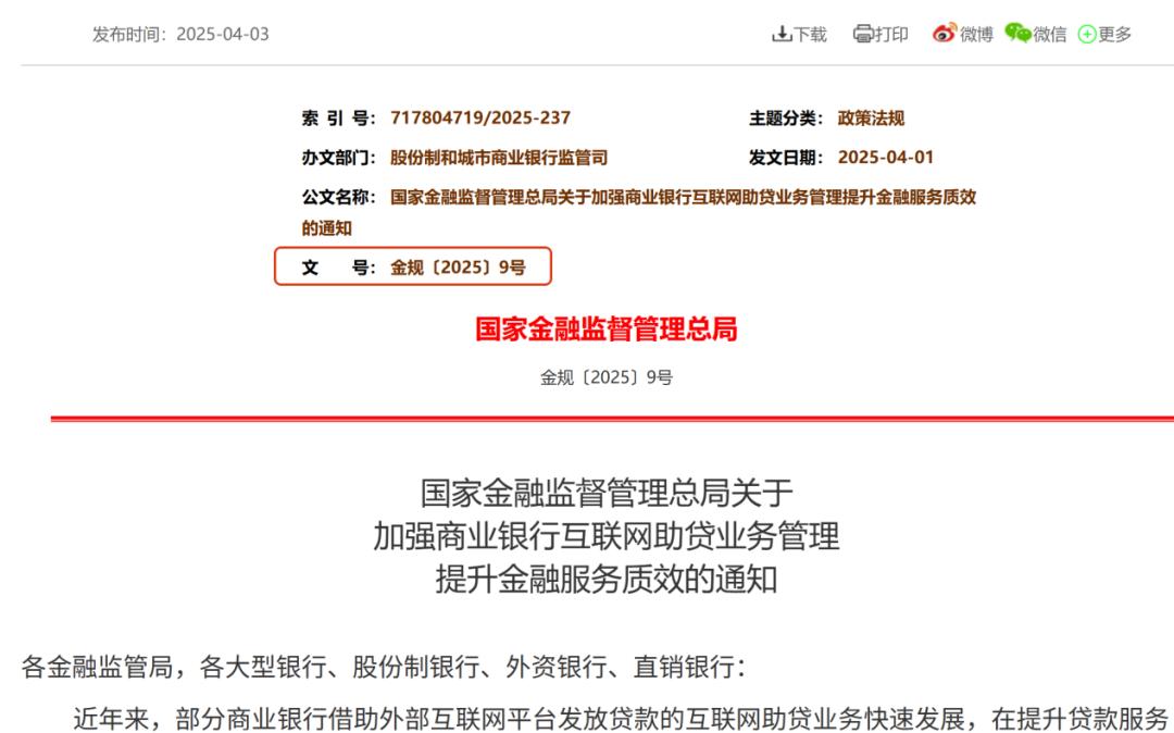 2025年4月3日,国家金融监管总局印发《关于加强商业银行互联网助贷业务管理提升金融服务质效的通知》,即金规〔2025〕9号,简称9号新规。在2025年10月1日正式落地,被业内称为“网贷监管史上最严改革”。它不是简单收紧,是从底层逻辑上重构助贷模式,对银行、平台、借款人影响深远,直接重塑行业格局。