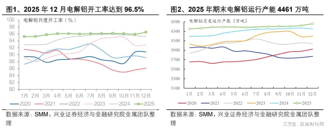 而在供给侧方面,不同于海外铝供给的高度不确定性,国内铝供给在刚性约束下维持长期紧缺格局几乎没有任何悬念。截至去年底,中国原铝已建成产能4621万吨、运行产能4461万吨,产能利用率接近满产,并逼近产能天花板;结合多方分析,今年将会是国内电解铝产能增长的最后一年,年内预计新增产能不足60万吨。