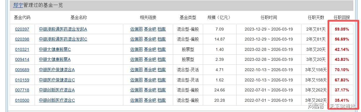 横向对比更能说明问题。截至2026年3月27日,近三年中证医疗指数收益率约为-14%,沪深300收益率也只有约4%,郑宁管理的多只基金取得35%-59%的任职回报,的确十分不易。
