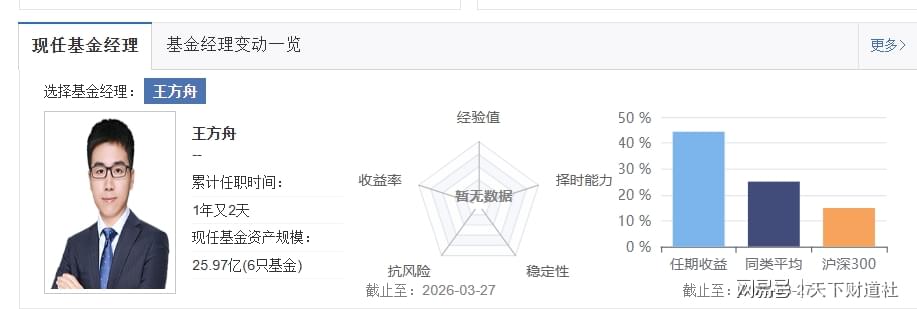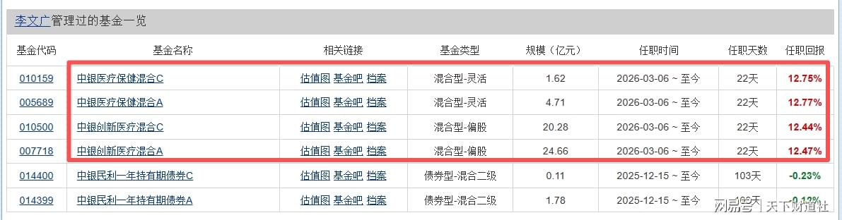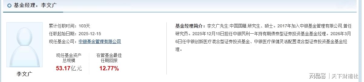 只是,天天基金网显示,李文广在中银基金曾有研究员的经历,2025年12月才加入基金经理行列,最开始还是管理债券类产品,到如今,他累计任职基金经理也才100多天。