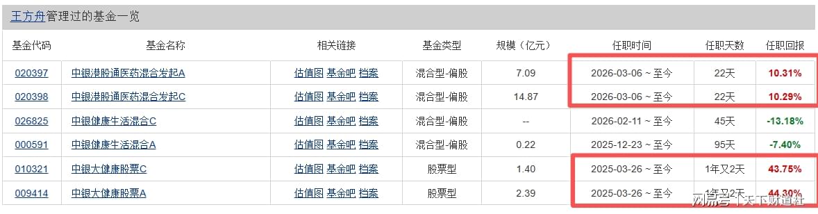 郑宁之前的另外2只基金,则由王方舟接任。其中,中银港股通医药混合发起基金,王方舟是从今年3月6日起,开始与郑宁共同管理。
