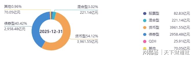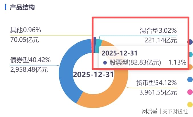 靠余额宝一战成名,过去让人感觉主要靠固收产品打天下的天弘基金,总管理规模更大一些,恰好也是与中银基金同年成立的,目前其权益产品的发展步伐已大大加快,截至2025年末的权益占比已接近15%。