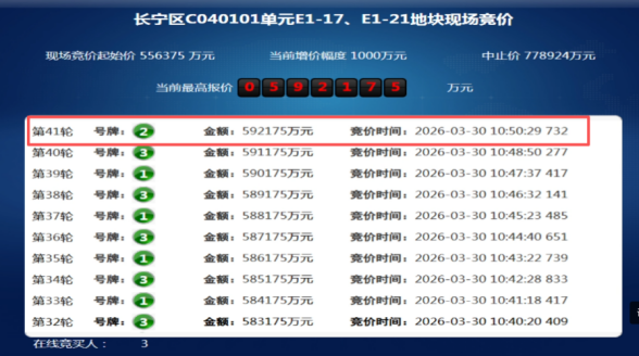 上午10时竞拍开始,1号与3号竞买人轮番出价、激烈角逐,2号竞买人则全程按兵不动。竞价快速推进至第40轮,报价升至59.12亿元,此时,一直缄默的2号竞买人终于出手,报出59.22亿元,1号、3号竞买人均未再跟进,凭此这一次关键报价2号竞买人成功摘地。最终,地块溢价率6.43%,成交楼板价7.77万元/平方米。