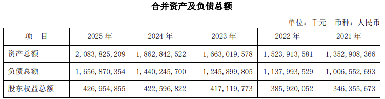 总资产大增的前提下,其负债总额也连续四年上升。自2021年以来,其负债总额分别是1万亿元,1.14万亿元,1.25万亿元,1.44万亿元,再到2025年的1.66万亿元。