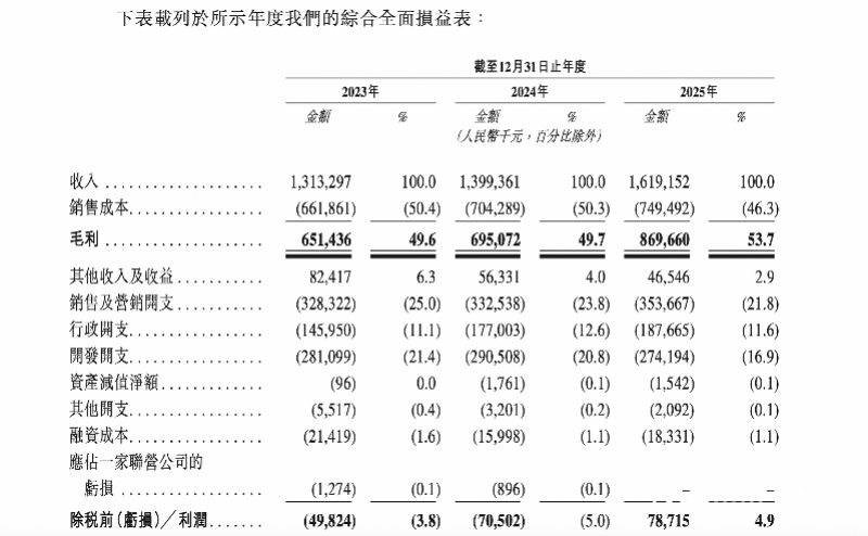麦科田盈利改善核心在于毛利率持续优化。2023至2025年,公司整体毛利率从49.6%升至53.7%,累计提升4.1个百分点,主要得益于高毛利的微创介入业务占比提升、规模效应显现及供应链成本管控。