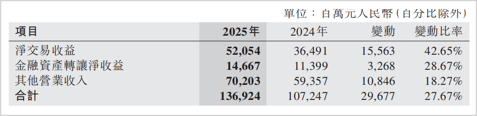 同时,中国银行的其他非利息收入增速较快,是推动非息收入增长的重要推手。2025年该行其他非利息收入1369.24亿元,同比增长了27.67%。