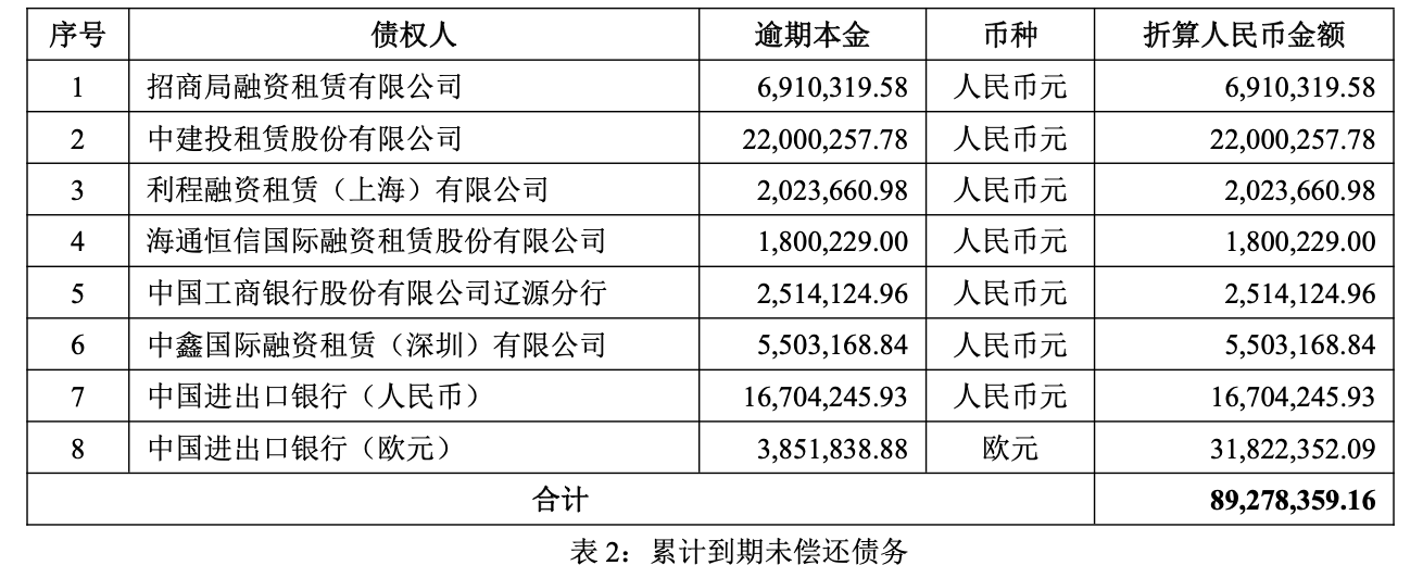 截至2025年12月22日,公司累计到期未偿还债务本金为0.89亿元,约占2024年度经审计净资产的25.43%。实际上,截至2025年三季度末,利源股份净资产为2.78亿元,较2024年末又下降了0.88亿元。2026年1月31日,中建投租赁股份有限公司就已起诉利源股份,要求其支付对应逾期款项及利息。