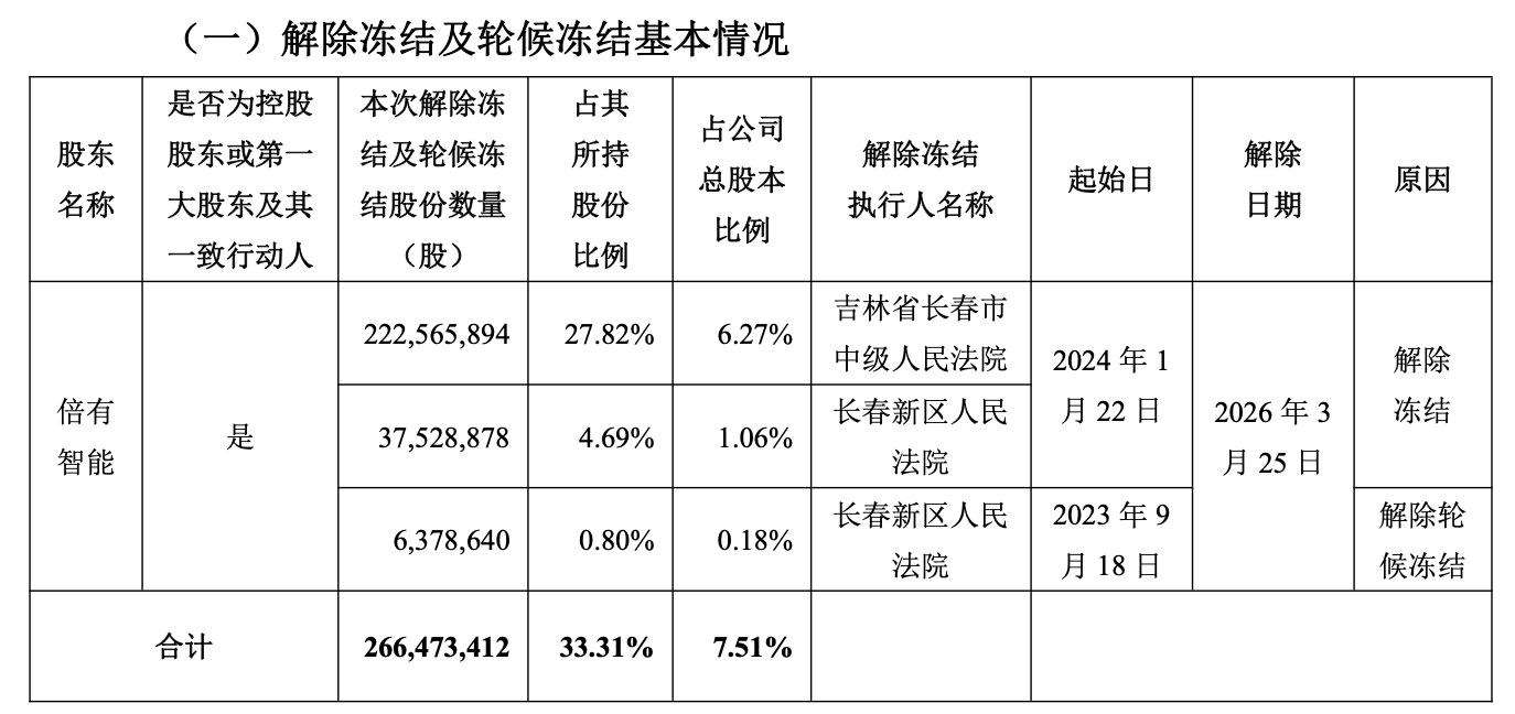 上周,利源股份发布公告称,2026年3月25日,倍有智能所持33.31%公司股份(占公司总股份比例的7.51%)成功解除冻结;不久后,如开篇所述,倍有智能剩余被冻股份全部成功解冻。