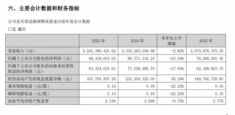 3月30日,深纺织A(000045.SZ)发布2025年年报。报告期内,公司实现营业收入32.41亿元,同比下降2.82%;实现归母净利润6841.87万元,同比下滑23.44%,结束此前连续六年净利增长态势。尽管盈利承压,公司经营活动现金流净额达3.48亿元,同比大增50.39%。