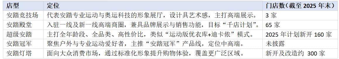 2025年,安踏主品牌也在渠道上进行了改革,根据不同消费人群布局了不同店型。其中有类似大卖场、覆盖全品类的“超级安踏”;聚焦专业运动与高端体验的“安踏竞技场”;定位高端商圈的“安踏殿堂”;面向大众消费市场的“安踏灯塔”。