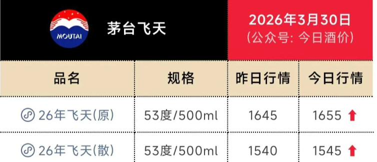 随着春节消费高峰过去,通常来说白酒终端价格会有走低势头。然而,根据第三方平台今日酒价的统计数据,3月30日原箱飞天茅台终端零售价为1655元/瓶,显示出贵州茅台近期的市场行情处于较为平稳的位置,这也给了茅台涨价的信心。