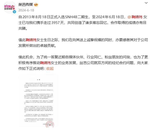 此次举报并非突发,而是丝芭传媒与鞠婧祎长期合约纠纷的集中爆发。据悉,双方的矛盾根源可追溯至2024年6月,鞠婧祎主张其与丝芭传媒签订的《专属艺人合约》已于该月到期终止,而丝芭传媒则出示一份2018年的《补充协议》,声称已将独家经纪权延长至2033年,双方就合约有效性陷入争执。法院曾两次委托笔迹鉴定,结论均为“无法判断补充协议签名为鞠婧祎本人所写”,丝芭传媒的主张因缺乏有效举证未被采信,双方的经纪合约纠纷至今仍处于司法审理阶段。