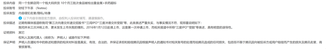很明显,钱大妈药残一文并没有其“三闯IPO”的内容,“钱大妈”的PR哭错坟了。不过出于职业习惯,我们的好奇心又来了:为何“钱大妈”PR会以这个“哭错坟”的内容去投诉钱大妈药残一文呢?