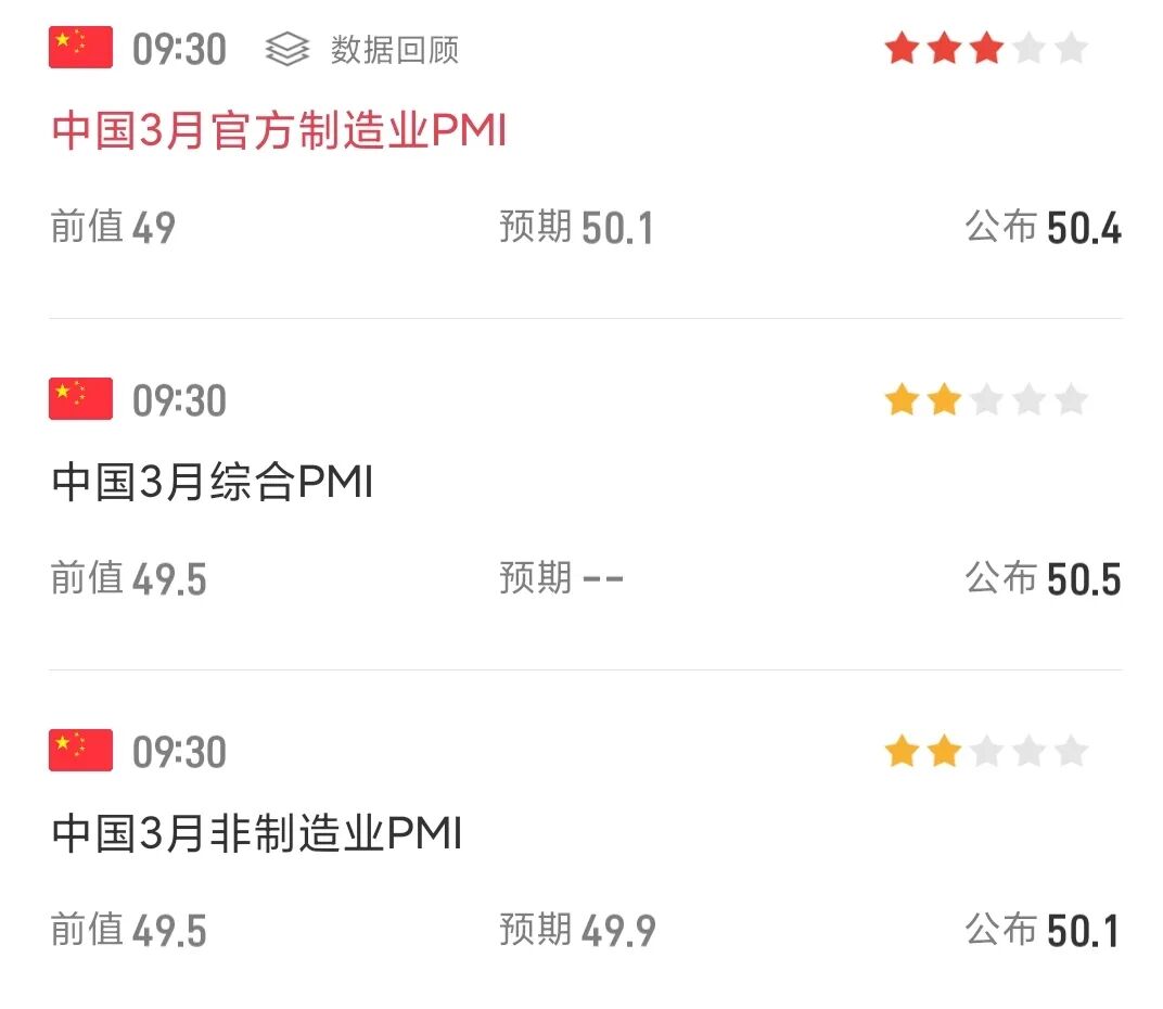据统计局,中国3月份官方制造业PMI为50.4%,好于市场预期,在连续2个月运行在50%以下后回到扩张区间,显示制造业景气程度提升。