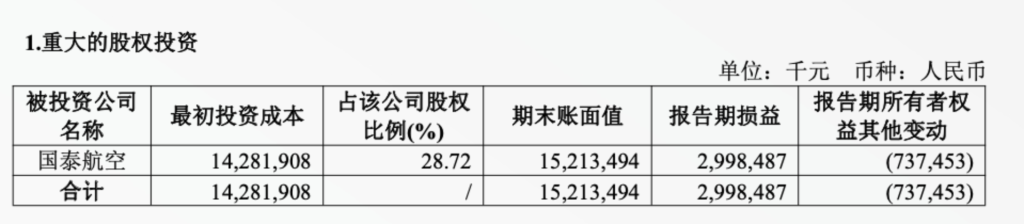 此外,股权投资方面,国航集团确认长期股权投资的余额为182.93亿元,较上年末增加8.13%。其中,对国泰航空的股权投资余额为152.13亿元,较上年末增加7.36%。