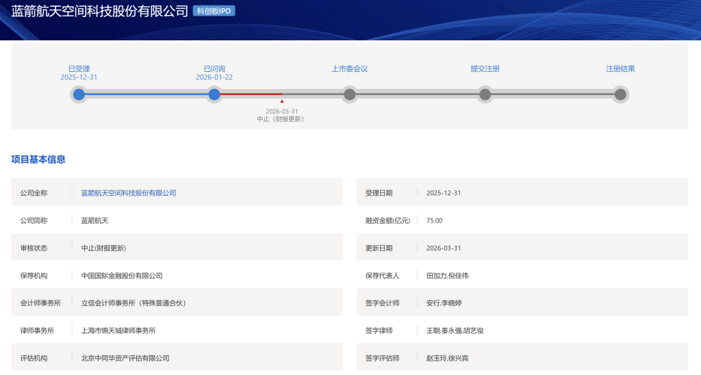蓝箭航天称,目前,公司正按规定推进财务数据更新、审计及申报文件补充工作。上述“中止”不属于终止审核,后续公司将按规定及时提交更新材料。