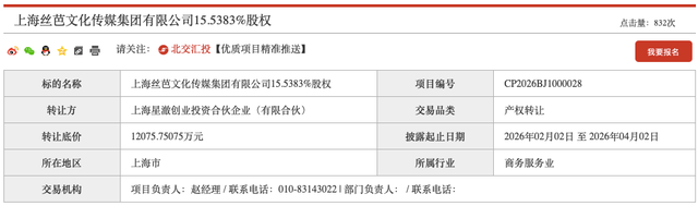 据北京产权交易所披露,2026年2月,君联资本旗下平台上海星澈创业投资合伙企业(有限合伙)(下称“上海星澈”),计划清仓所持有的15.54%丝芭传媒股权,转让价格仅1.21亿元,以此计算,公司估值暴跌至7.77亿元,较巅峰时期缩水近85%。