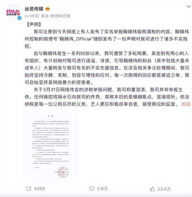 鞠婧祎的前公司丝芭传媒也迅速作出回应,表示我司郑重澄清,我司并非举报主体。任何操控将祸水引向我司的作秀,其根本目的是模糊焦点,混淆视听。