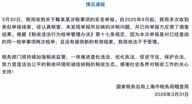 据国家税务总局上海市税务局稽查局消息,3月30日,我局收到关于鞠某某涉税事项的实名举报。自2025年9月起,我局多次收到类似举报线索,经认真核查,未发现举报所反映的涉税问题,并已向举报方反馈了调查结果。