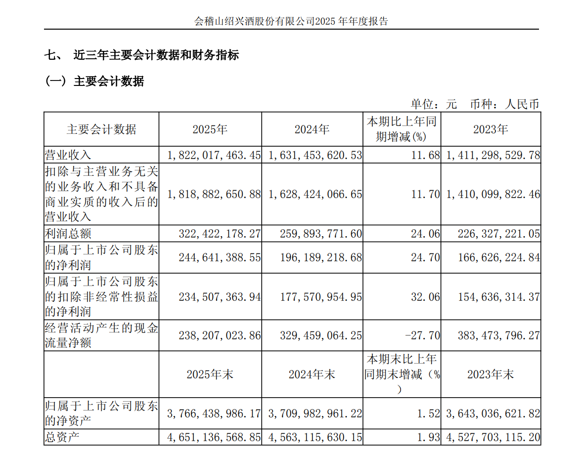 3月31日,会稽山绍兴酒股份有限公司(会稽山,601579.SH)发布2025年年度报告,报告期内,公司实现营业收入18.22亿元,同比增长11.68%;归母净利润2.45亿元,同比增长24.7%。公司拟向全体股东每10股派发现金股利3.00元(含税),合计2025年度公司拟派发的现金红利为1.41亿元(含税)。