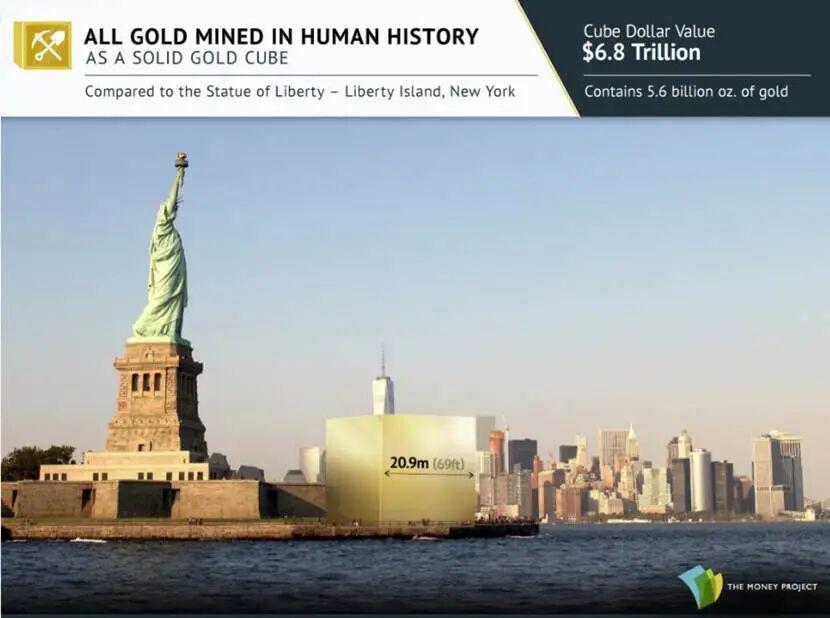 今天世界上所有开采出的黄金,约为22万吨,如果熔化成一个实心正方体,大约是22.5米边长的一大块金属。