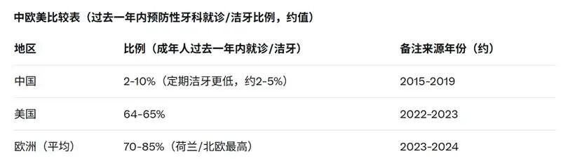 中国居民预防性口腔就诊习惯较差,定期牙科就诊率仅约2-10%。