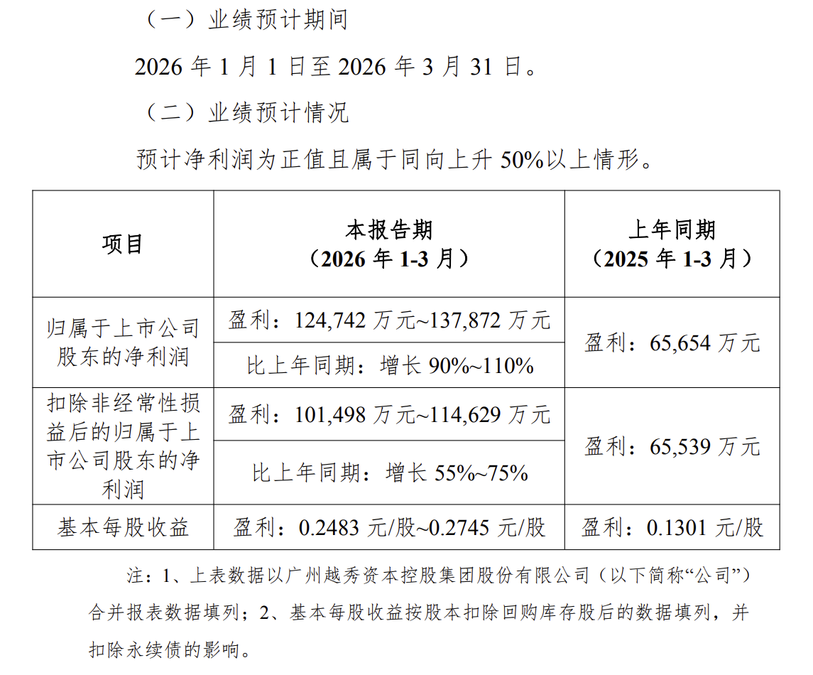 4月10日,广州越秀资本控股集团股份有限公司(证券简称:越秀资本)发布2026年第一季度业绩预增公告,公告显示一季度越秀资本归属于上市公司股东的净利润预计盈利12.47亿元至13.79亿元,比上年同期增长90%~110%,有望实现倍增的好成绩。公告中表示,业绩大幅预增主因为公司控股子公司广州资产管理有限公司投行化转型成效显著,相关业务收益大幅提升。