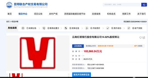 根据披露,此次昆明产投在昆明联合产权交易平台挂牌转让所持红塔银行14.52%股权,涉及股份9.1455亿股,这也是昆明产投所持有的红塔银行全部股权,挂牌总价为10.206亿元。