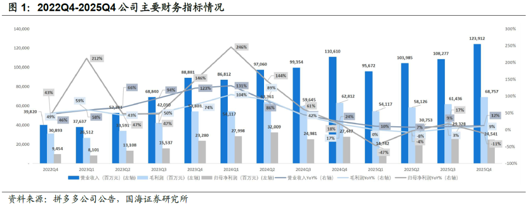 财报显示,拼多多2025年第四季度实现营收1239亿元,同比增长12%;归母净利润245亿元,同比下降11%。2025年全年营收4318亿元,同比增长10%;其中,在线营销服务及其他收入2178亿元,同比增长10%,保持了双位数增长。交易服务收入2141亿元,同比增长9%,该部分主要包含跨境电商业务的交易佣金及国内主站的交易服务费。然而,归母净利润却同比下降12%,为994亿元。