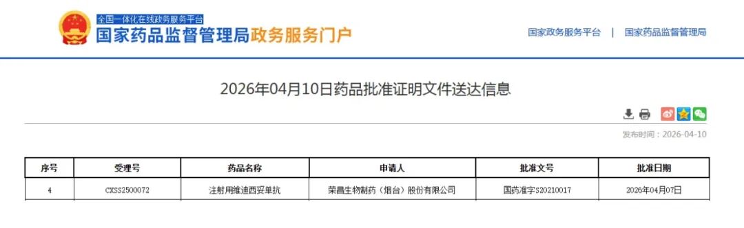 4月10日,荣昌生物(688331.SH/09995.HK)宣布,公司自主研发的抗体偶联(ADC)药物维迪西妥单抗(RC48,爱地希®)一项新适应症获国家药品监督管理局正式批准上市,用于联合特瑞普利单抗治疗HER2表达的局部晚期或转移性尿路上皮癌患者,HER2表达定义为HER2免疫组织化学检查结果为1+、2+或3+。这标志着维迪西妥单抗的治疗范围从后线成功拓展至一线,为中国HER2表达晚期尿路上皮癌患者带来了全新的治疗选择,也成为全球首个获批一线治疗晚期尿路上皮癌的HER2-ADC药物。
