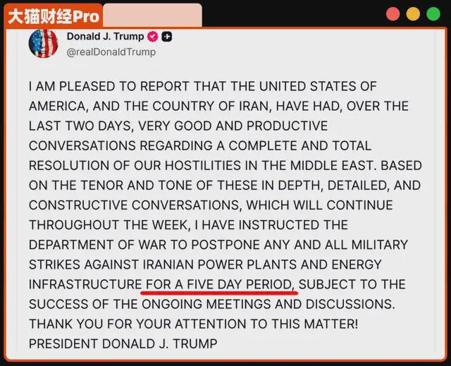 15分钟后,特朗普发了社媒,“对伊朗发电厂和能源设施的打击推迟5天”。