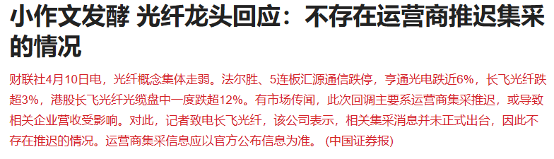 今天盘中有消息称运营商集采推迟,光纤板块跳水,法尔胜、汇源通信跌停,亨通光电大跌近6%。