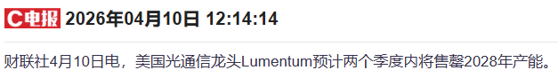 美国光通信龙头Lumentum预计两个季度内将售罄2028年产能。 受该消息刺激,a股光芯片板块午盘爆拉,源杰科技一度涨超12%,永鼎股份涨停,东山精密一度涨停,中际旭创市值突破8000亿。