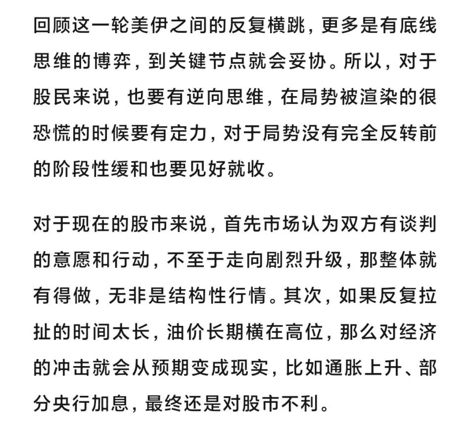 前天ktv、昨天icu、今天又是ktv,上证指数盘中一度收复4000点,创业板指更是盘中创出年内新高,这要是前天追进去,昨天又割肉,今天那真是两眼一黑。所以,我们昨天提到,只要局势不走向升级,那起码有结构性行情可以走,实际上市场短期内对油价相对免疫,昨天盘后油价再次破100,美股也没低开,纳指都七连涨了;其次,要逆向去做,在局势恐慌的时候要有定力。