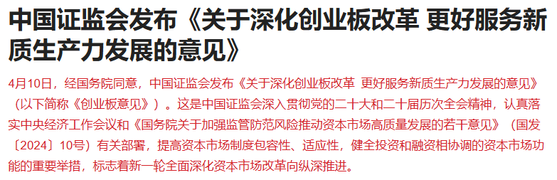 中国证监会发布《关于深化创业板改革 更好服务新质生产力发展的意见》(以下简称《创业板意见》)。