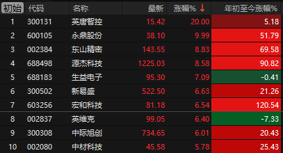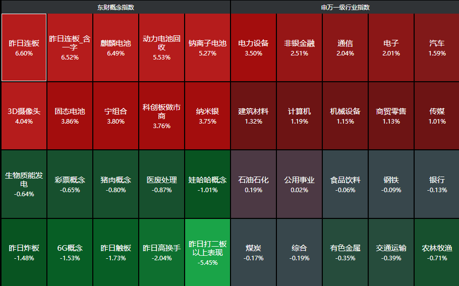 分行业来看,电力设备、非银金融、通信、电子、汽车等行业领涨,银行、钢铁、食品饮料三大行业下跌。