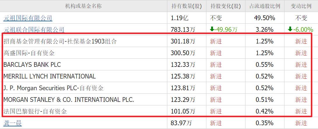 而高盛、巴克莱、美林、J.P摩根、摩根斯坦利、法国巴黎银行,七家外资分别新进第四和第九大流通股东。