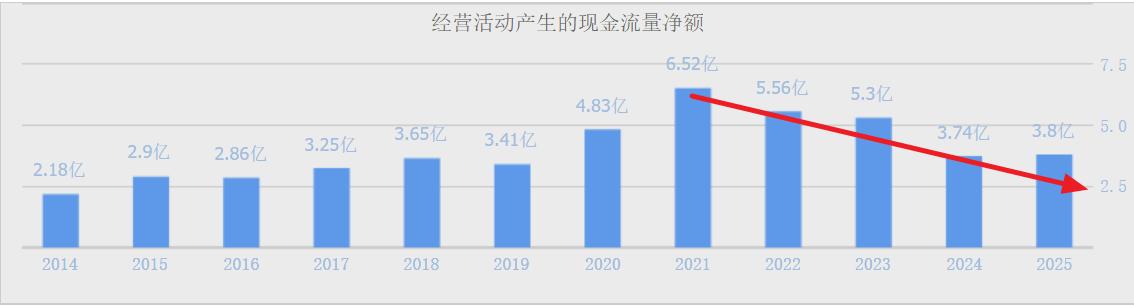 每年都是正向流入的,表明公司的市场地位和回款能力还是得到认可的,但现金流也在随着公司的营收下降而下降。
