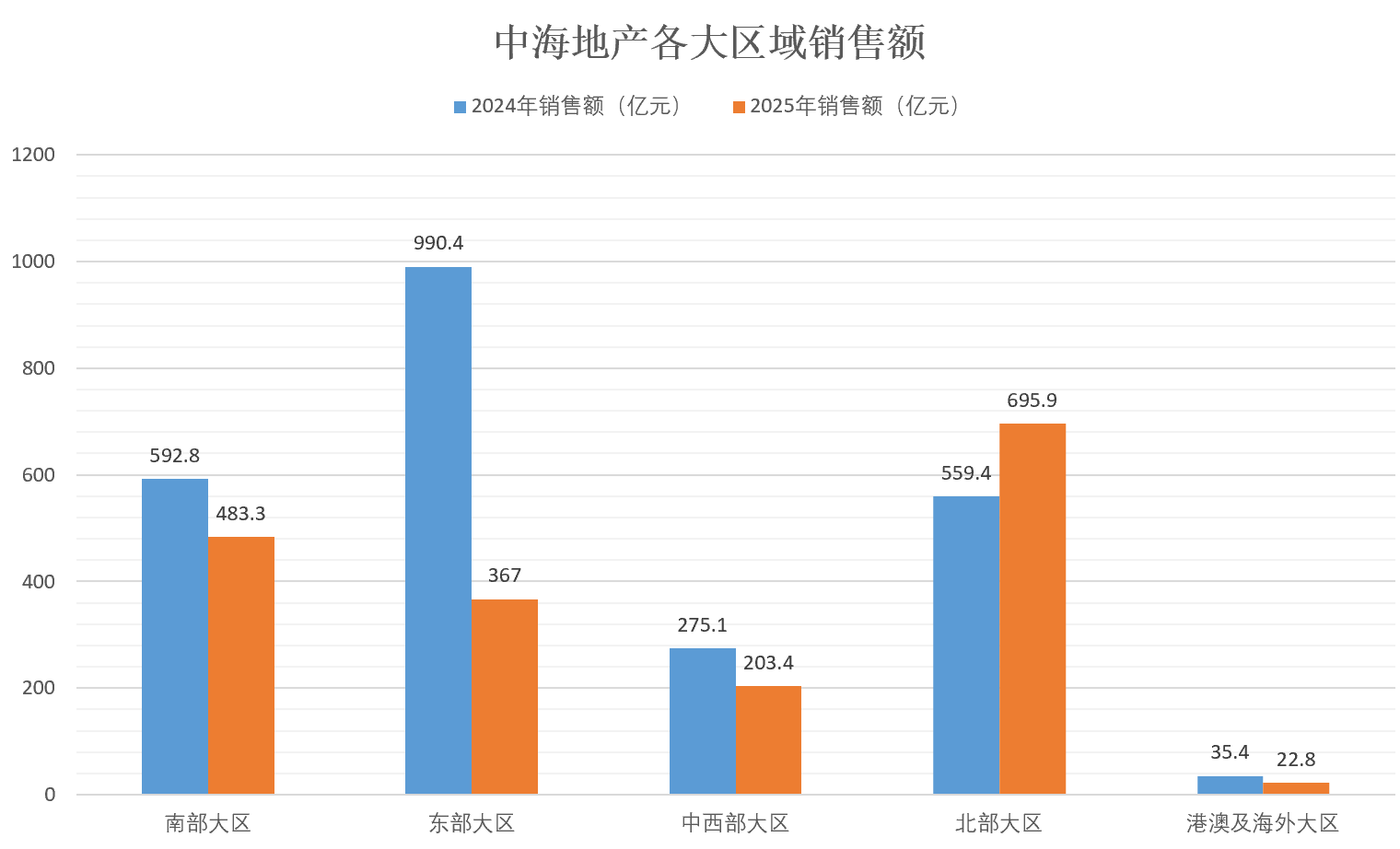 按地区划分,2025年,北区是为集团贡献销售额最多的区域,为695.9亿元,占比27.7%;南部大区、东部大区、中西部大区、港澳及海外大区的销售额分别是483.3亿元、367.0亿元、203.4亿元、22.8亿元,占比分别为19.2%、14.6%、8.1%、0.9%。对比2024年,除了北区销售额上涨24.4%外,其他区域全线下滑,且东部大区下滑最多,从2024年的990.4亿元下降至2025年的367.0亿元,降幅为62.9%。