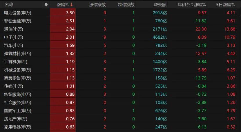 电源设备、非银金融、通信、电子、汽车、计算机、机械设备等板块走强。