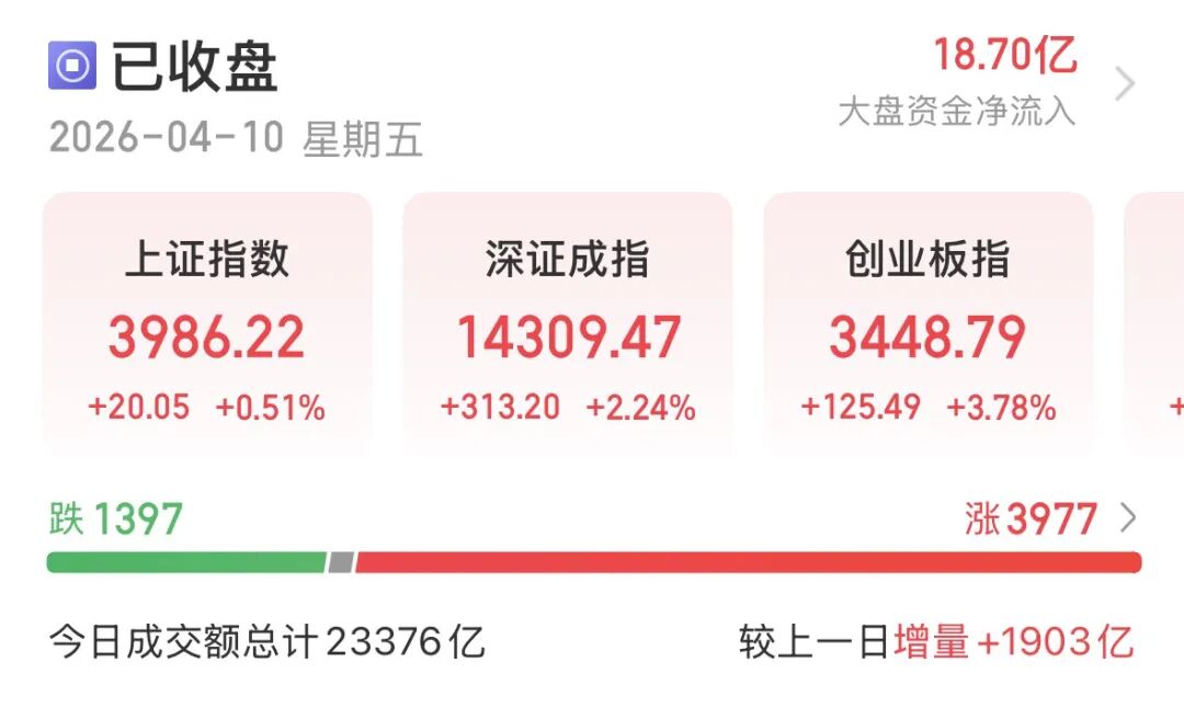 4月10日,A股赚钱效应不错,沪指盘中重返4000点上方,创业板指涨近4%,3977只个股收红,量能放大至2.34万亿元,电力设备、电子、通信板块领涨,非银金融板块走强。