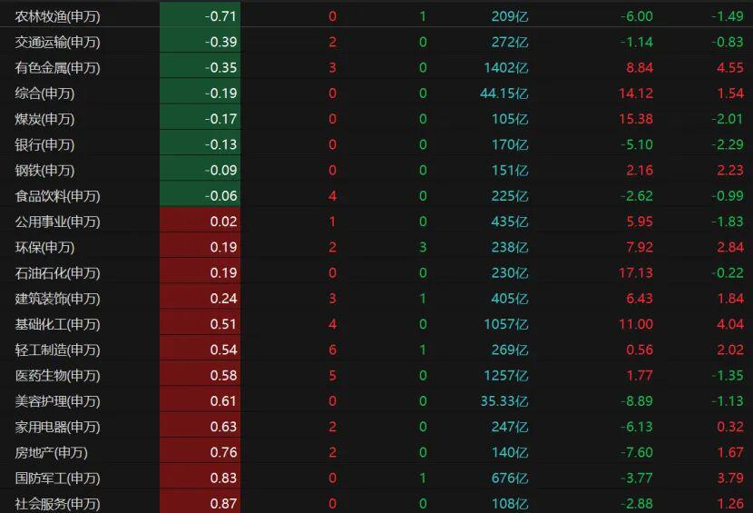 农林牧渔、交通运输、有色金属、煤炭、银行、钢铁、食品饮料板块收跌。