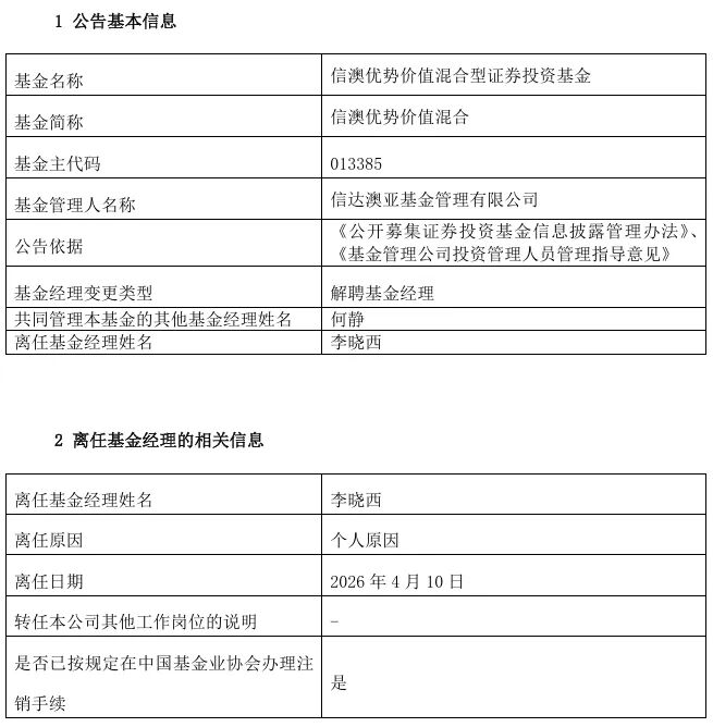 4月10日,信达澳亚基金发布多份人员变更公告,李晓西因个人原因于4月8日离任公司副总经理,且不再转任公司其他工作岗位。同日,李晓西卸任上述两只基金的基金经理职务,分别由何静和孔晓语单独管理。至此,李晓西已无在管基金。
