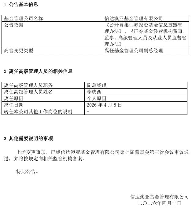 4月10日,信达澳亚基金发布高管变更和基金经理变更等多份公告,李晓西因个人原因于4月8日离任副总经理职务,并于4月10日卸任信澳优势价值和信澳价值精选的基金经理职务,两只基金将分别由共同管理的基金经理何静、孔晓语单独接手。