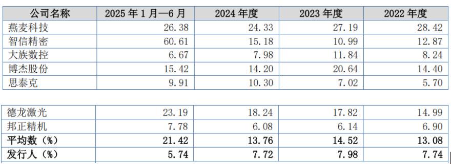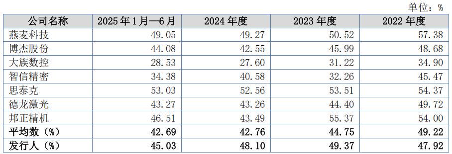 报告期,锐翔智能主营业务毛利率(剔除评估增值影响)分别为47.92%、49.37%、48.10%、45.03%。与可比同行均值相比,公司的毛利率从略低到实现反超。