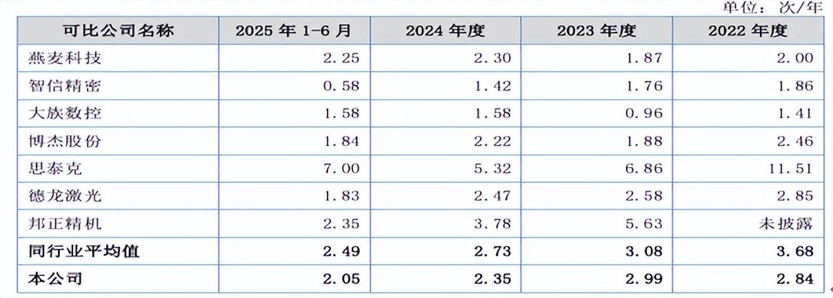 报告期内,锐翔智能应收账款周转率分别为2.84次/年、2.99次/年、2.35次/年和2.05次/年。2024年,公司应收账款周转率有所下降。可比同行应收账款周转率分别为3.68次/年、3.08次/年、2.73次/年和2.49次/年。